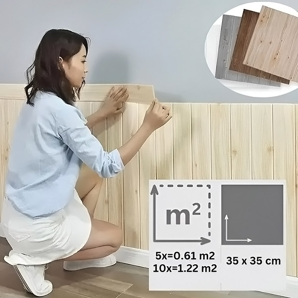 Fiecare pachet conține 5 bucăți (35×35 cm), care acoperă 0,61 m². Înainte de a începe, calculați de câte pachete veți avea nevoie în funcție de suprafața pereților dvs. Cumpărați mai multe pachete pentru spații mai mari și beneficiați de reduceri pentru cantități mari!