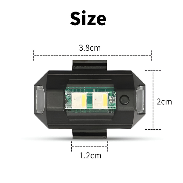 📏 Compacte și ușoare – 3,8 x 2 cm, carcasă din ABS, set de 2 lumini cu pad-uri velcro, inele de cauciuc și cablu de încărcare USB incluse.